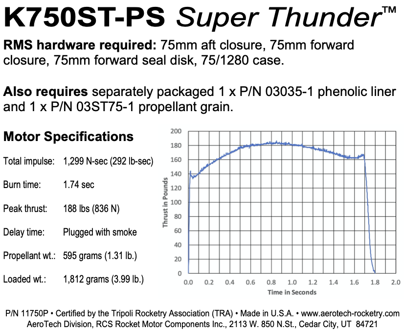 This RMS motor reload utilizes RCSs exclusive Super Thunder™ aerospace grade composite propellant formulation, which produces a bright violet-blue flame with a minimum of exhaust smoke. Super Thunder™ motors provide a higher ISP than Blue Thunder™.