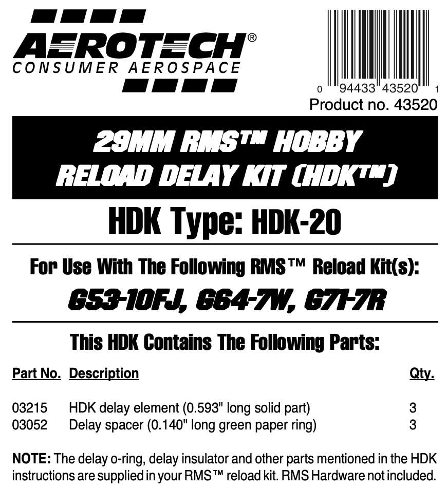 The AeroTech HDK-20 is for use with G64-7W (76407) and G53-10FJ (73310) motors. The motor hobby delay kit comes with 3 rocket delay elements and spacers. Motor delay O-rings, delay insulators and other parts are supplied with the RMS reload kits. Note that Hobby Delay Kits and High Power Delay Kits are not interchangeable.