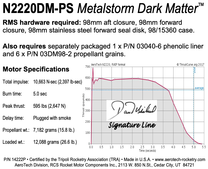 This RMS motor reload utilizes RCSs exclusive Dark Matter™ aerospace grade composite propellant formulation. Dark Matter™ is a sparky propellant, but unlike Metalstorm™ with its higher ISP and white smoke, Dark Matter™ is a black smoke sparky motor. As with all rocket motors using spark-generating propellants, special precautions must be taken to avoid fires around the launch pad by clearing the immediate area of all combustible materials in accordance with applicable fire and safety codes.