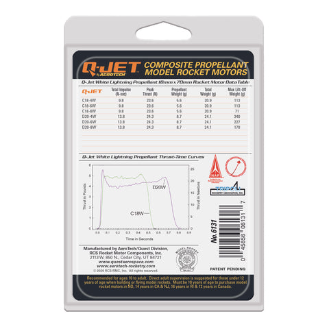 Quest Q-Jets are the world's most advanced 18mm model rocket motors. Q-Jet™ high performance, composite propellant model rocket motors use the same family of solid propellant as NASA’s Space Shuttle Boosters, military missiles, sounding rockets, and NASA’s future SLS moon rocket. They utilize a patent pending high-strength polymer case and bulkhead, ceramic nozzle and RCSs exclusive White Lightning™ aerospace grade composite propellant formulation, which produces nearly double the specific impulse (or ISP, a propellant efficiency rating) of conventional black powder propellant. They are not susceptible to thermal cycling like black powder motors. Q-Jet™ White Lightning™ rocket motors deliver a brilliant white exhaust plume, dense bright white smoke trail and a throaty roar as the hallmarks of this popular propellant. Easy to track. Exciting to watch!