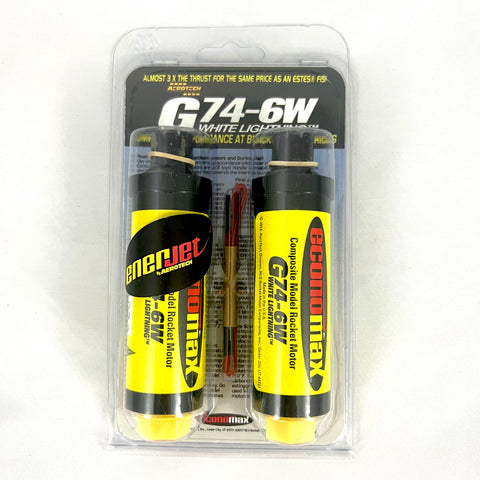 Enerjet G74-6W mid-power motors are single-use composite propellant model rocket motors. These high performance, composite propellant model rocket motors use the same family of solid propellant as NASA’s Space Shuttle Boosters, military missiles, sounding rockets, and NASA’s future SLS moon rocket. They utilize a patent pending high-strength polymer case and bulkhead, polymer nozzle and RCSs exclusive White Lightning™ aerospace grade composite propellant formulation, which produces a gorgeous bright white flame with lots of smoke and a throaty roar.