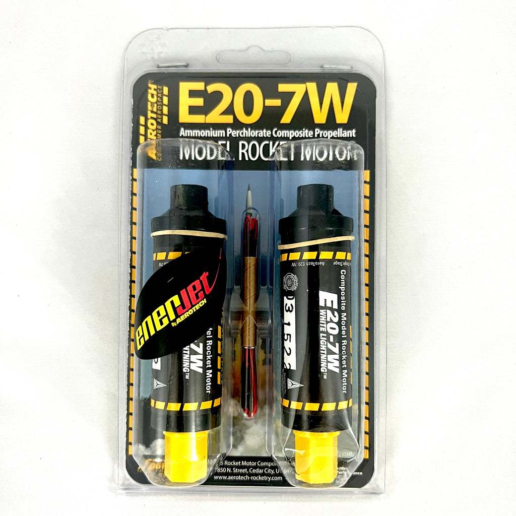 Enerjet E20-7W mid-power motors are single-use composite propellant model rocket motors. These high performance, composite propellant model rocket motors use the same family of solid propellant as NASA’s Space Shuttle Boosters, military missiles, sounding rockets, and NASA’s future SLS moon rocket. They utilize a patent pending high-strength polymer case and bulkhead, polymer nozzle and RCSs exclusive White Lightning™ aerospace grade composite propellant formulation, which produces a gorgeous bright white flame with lots of smoke and a throaty roar.