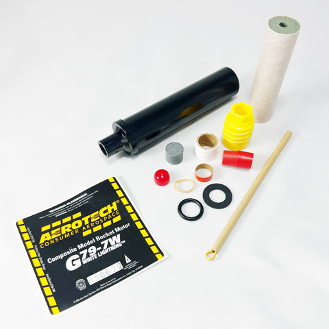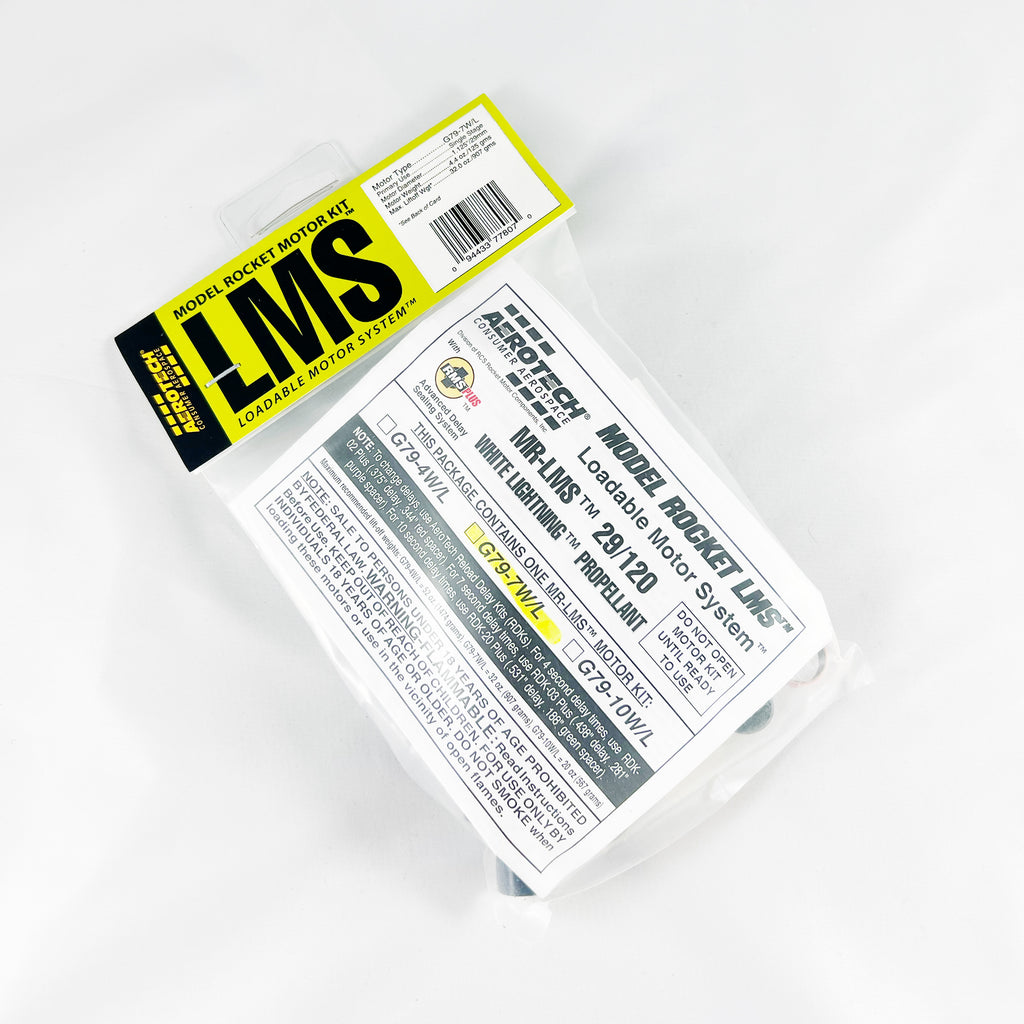 The AeroTech Loadable Motor System LMS is a single-use motor in kit form that is assembled by the user. All of the Aerotech LMS motors use all-disposable components. You will need 5-minute epoxy glue to assemble this motor, which is not included. This LMS motor utilizes a patent pending high-strength polymer case and bulkhead, polymer nozzle and RCSs exclusive White Lightning™ aerospace grade composite propellant formulation, which produces a gorgeous bright white flame with lots of dense white smoke and a throaty roar at lift-off.