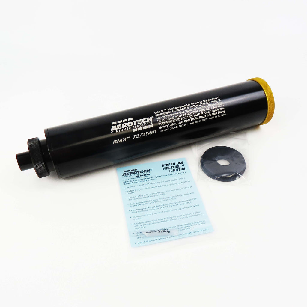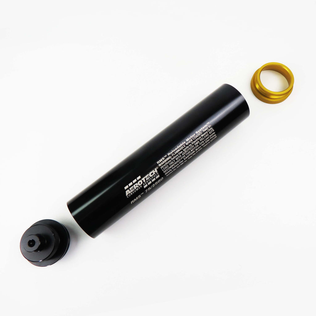 For use with all AeroTech RMS-75/2560 high power motor reload kits. This reusable AeroTech RMS-75/2560 motor hardware set includes the aluminum motor case, 75mm Forward Seal Disc, 75mm Forward Closure, 75mm Aft Closure, and a 1cc tube of the Super-Lube grease for assembly. Motor reloads sold separately. Important: High Power RMS reload kits are not compatible with Mid Power RMS products.