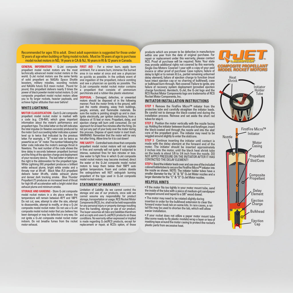 Quest Q-Jets are the world's most advanced 18mm model rocket motors. Q-Jet™ high performance, composite propellant model rocket motors use the same family of solid propellant as NASA’s Space Shuttle Boosters, military missiles, sounding rockets, and NASA’s future SLS moon rocket. They utilize a patent pending high-strength polymer case and bulkhead, ceramic nozzle and RCSs exclusive White Lightning™ aerospace grade composite propellant formulation, which produces nearly double the specific impulse (or ISP, a propellant efficiency rating) of conventional black powder propellant. They are not susceptible to thermal cycling like black powder motors. Q-Jet™ White Lightning™ rocket motors deliver a brilliant white exhaust plume, dense bright white smoke trail and a throaty roar as the hallmarks of this popular propellant. Easy to track. Exciting to watch!