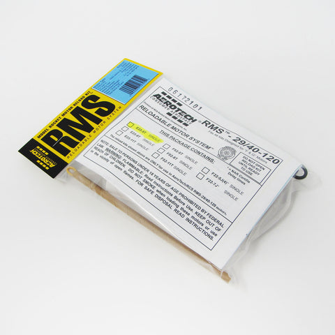 The AeroTech Reloadable Motor System RMS is an aluminum cased reusable motor in kit form that is assembled by the user. You will need AeroTech RMS-29/40-120 motor hardware to build and complete the motor for many reliable flights. Motor hardware is available separately in a complete set, and also as individual parts. Important: Mid Power RMS reload kits are not compatible with High Power RMS products. This RMS motor reload utilizes RCSs exclusive Blue Thunder™ aerospace grade composite propellant formulation, which produces a gorgeous bright violet-blue flame with a minimum of exhaust smoke. Blue Thunder™ motors provide a higher level of thrust than White Lightning™ motors of the same total impulse and are perfect for high lift-off acceleration.