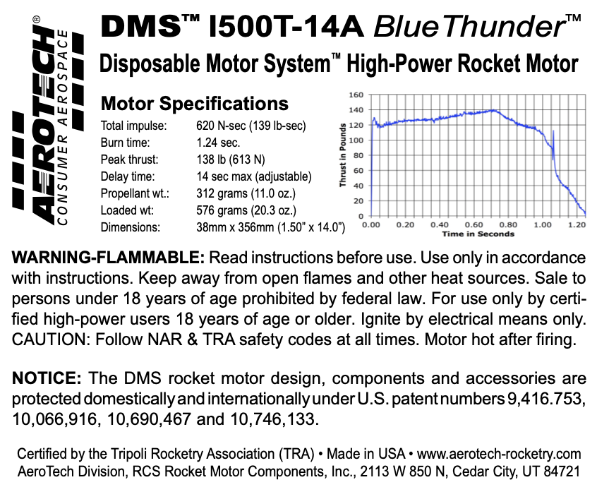 DMS motors feature a filament-wound fiberglass casing, a glass-reinforced composite phenolic nozzle, a molded plastic bulkhead and RCSs exclusive Blue Thunder™ aerospace grade composite propellant formulation, which produces a gorgeous bright violet-blue flame with a minimum of exhaust smoke. Blue Thunder™ motors provide a higher level of thrust than White Lightning™ motors of the same total impulse and are perfect for high lift-off acceleration.