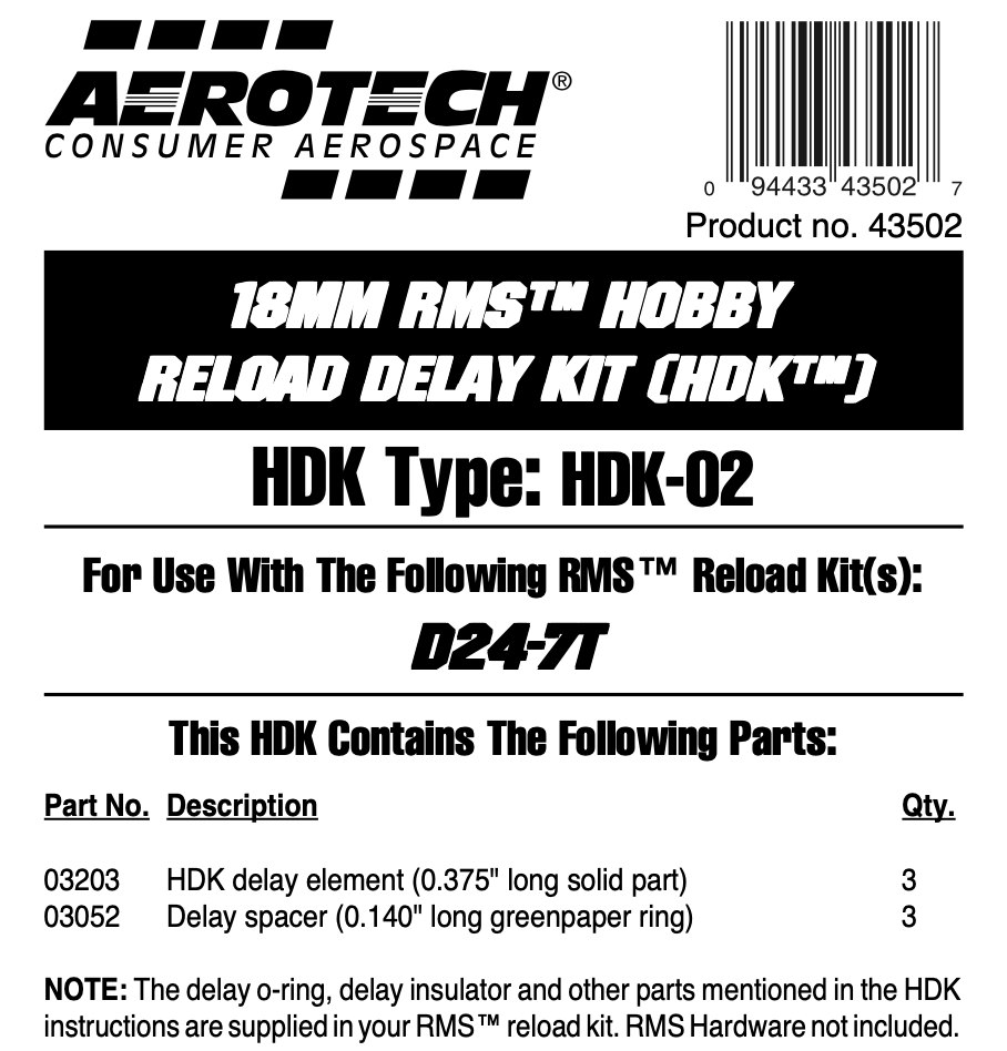 The AeroTech HDK-02 is for use with D24-7T (42407) motors. The motor hobby delay kit comes with 3 rocket delay elements and spacers. Motor delay O-rings, delay insulators and other parts are supplied with the RMS reload kits. Note that Hobby Delay Kits and High Power Delay Kits are not interchangeable.