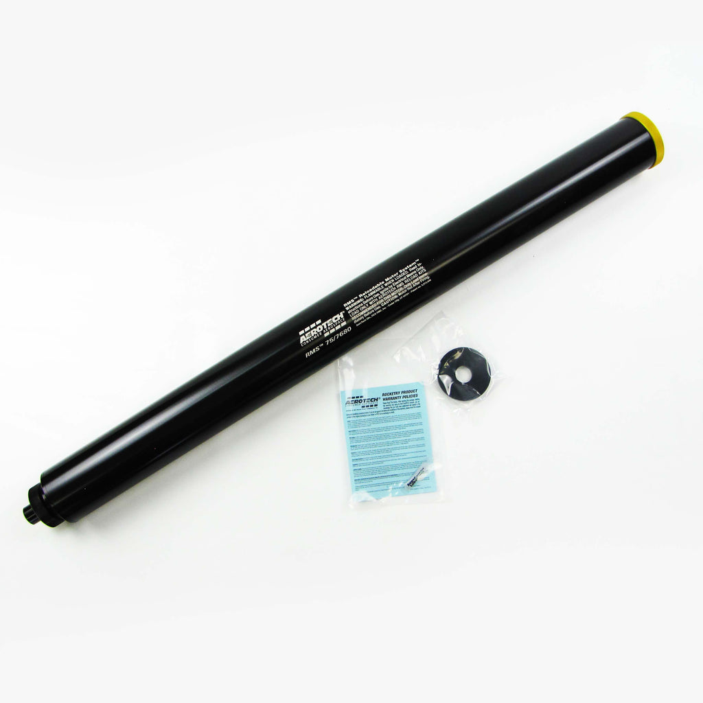 For use with all AeroTech RMS-75/7680 high power motor reload kits. This reusable AeroTech RMS-75/7680 motor hardware set includes the aluminum motor case, 75mm Forward Seal Disc, 75mm Forward Closure, 75mm Aft Closure, and a 1cc tube of the Super-Lube grease for assembly. Motor reloads sold separately. Important: High Power RMS reload kits are not compatible with Mid Power RMS products.