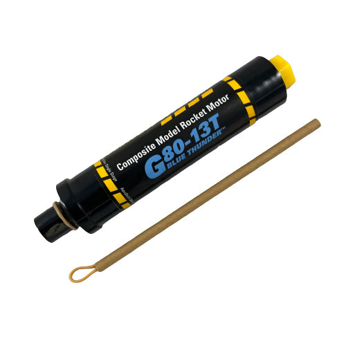 Enerjet G80-13T mid-power motors are single-use composite propellant model rocket motors. These high performance, composite propellant model rocket motors use the same family of solid propellant as NASA’s Space Shuttle Boosters, military missiles, sounding rockets, and NASA’s future SLS moon rocket. They utilize a patent pending high-strength polymer case and bulkhead, polymer nozzle and RCSs exclusive Blue Thunder™ aerospace grade composite propellant formulation, which produces a gorgeous bright violet-blue flame with a minimum of exhaust smoke. Blue Thunder™ motors provide a higher level of thrust than White Lightning™ motors of the same total impulse and are perfect for high lift-off acceleration.