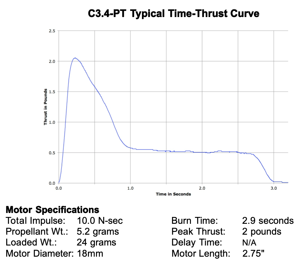 The C3.4T-P is a Plugged motor reload. Plugged reload kits do not utilize a motor-actuated delay or ejection charge. Plugged motors must be used in conjunction with a timer, altimeter or radio-activated recovery system. This motor was designed for R/C rocket gliders.